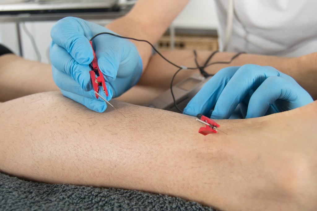 És una forma d’aplicar l’acupuntura on es fa passar un petit corrent elèctric entre les agulles sent complementària en el tractament.